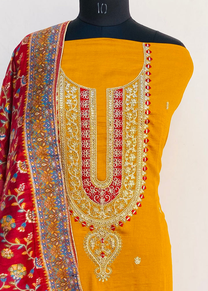 Designer Embroidered Suit Length 3 Piece Mustard Georgette With Sequence Work With Embroidered Mal Chanderi Dupatta & Same Colour Santoon Bottom