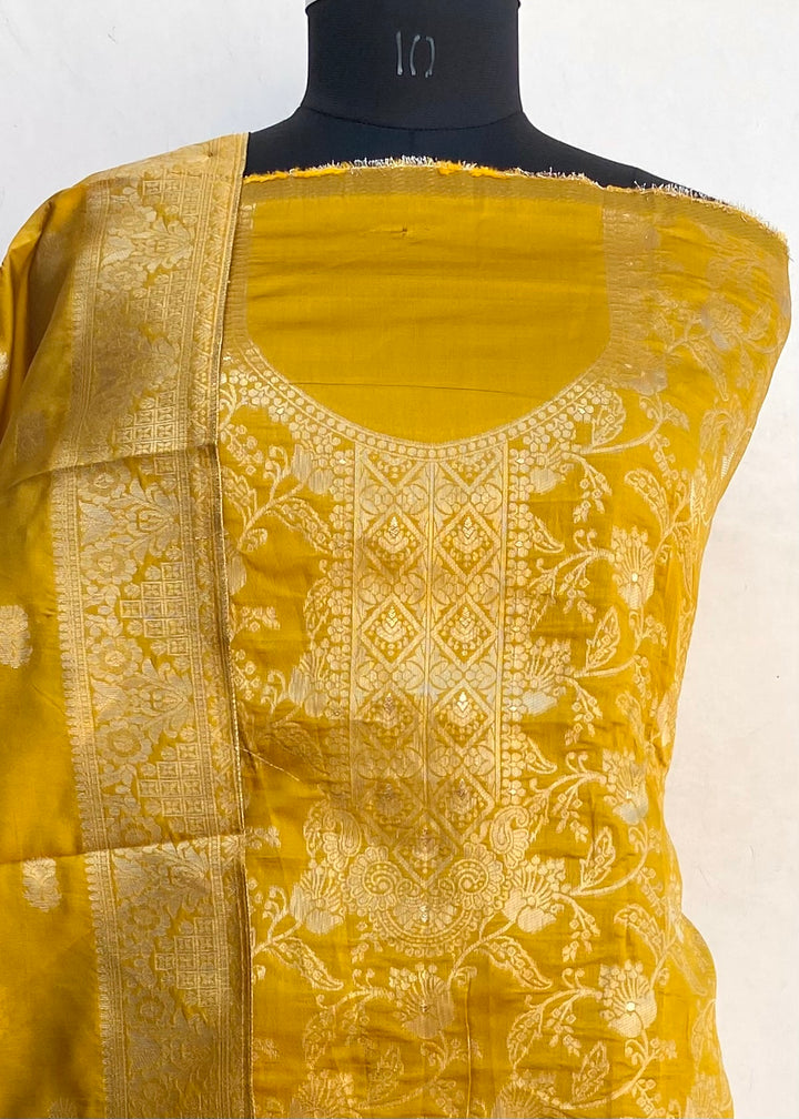 Designer Embroidered Suit Length 3 Piece Mustard Mal Chanderi With Embroidered Mal Chanderi Dupatta & Same Colour Santoon Bottom