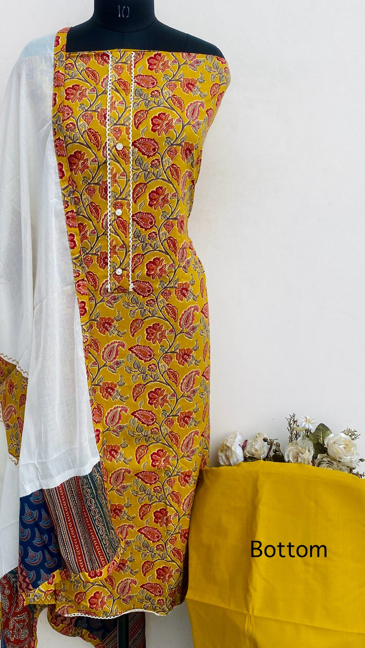 Designer Embroidered Suit Length 3 Piece Mustard Mal Cotton With Embroidered Mal Cotton Dupatta & Same Colour Cotton Bottom