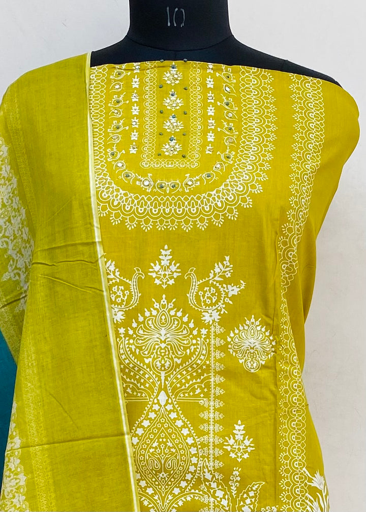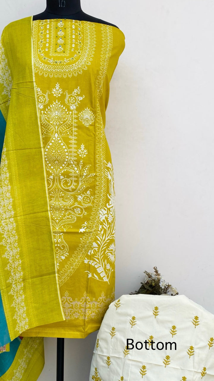 Designer Embroidered Suit Length 3 Piece Mustard Mal Cotton With Printed Mal Cotton Dupatta & Cream Colour Cotton Bottom