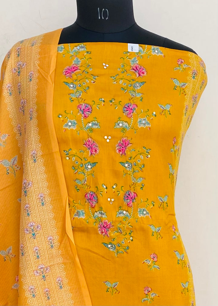 Designer Embroidered Suit Length 3 Piece Mustard Mal Cotton With Sequence Work