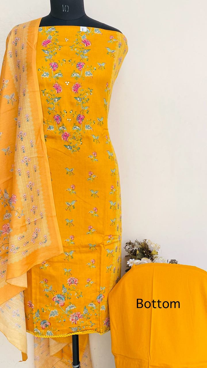 Designer Embroidered Suit Length 3 Piece Mustard Mal Cotton With Sequence Work With Printed Mal Cotton Dupatta & Same Colour Cotton Bottom