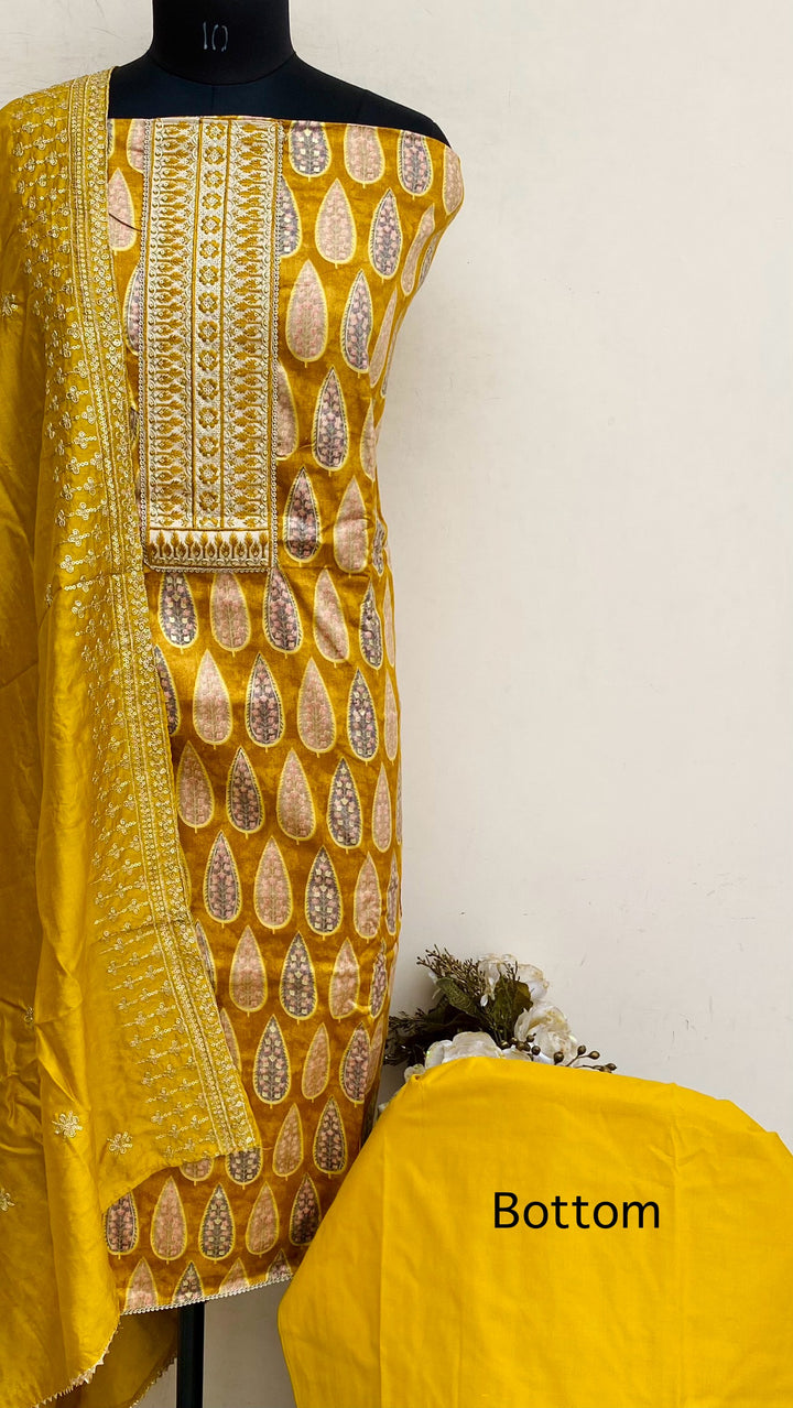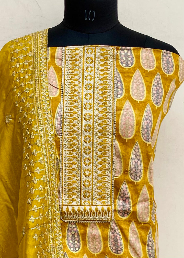 Designer Embroidered Suit Length 3 Piece Mustard Muslin Cotton With Sequence Work With Embroidered Muslin Dupatta & Same Colour Cotton Bottom