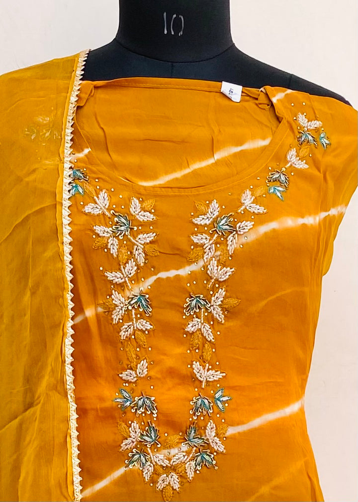 Designer Embroidered Suit Length 3 Piece Mustard Organza With Sequence & Cutdana Work With Pure Chiffon Dupatta & Same Colour Cotton Bottom
