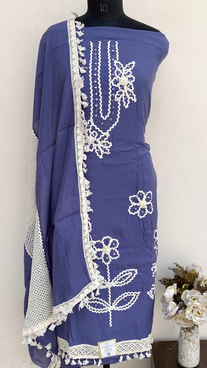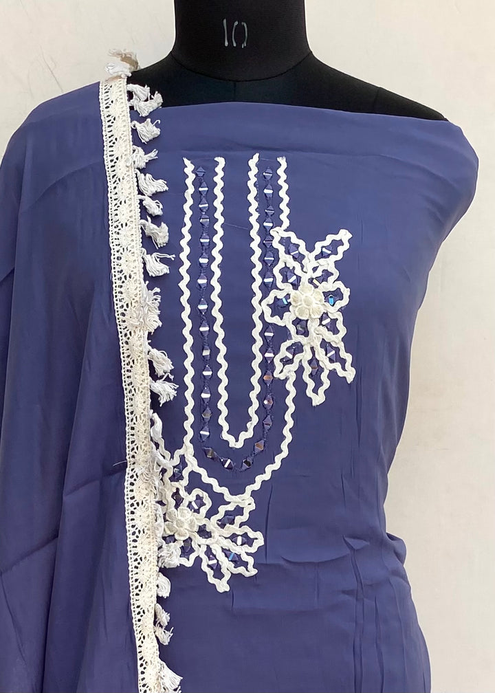 Designer Embroidered Suit Length 3 Piece Navy Blue Mal Chanderi With Mirror Work With Embroidered Mal Chanderi Dupatta & Same Colour Cotton Bottom