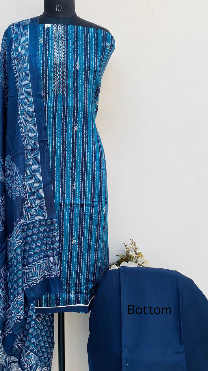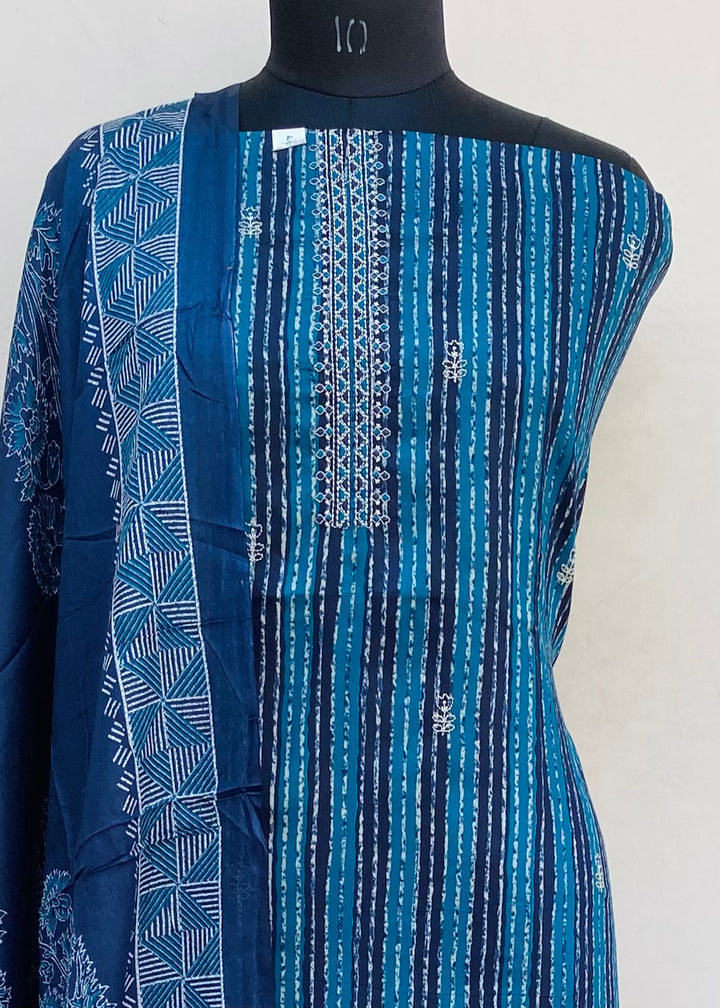 Designer Embroidered Suit Length 3 Piece Navy Blue Mal Cotton With Printed Mal Cotton Dupatta & Same Colour Cotton Bottom