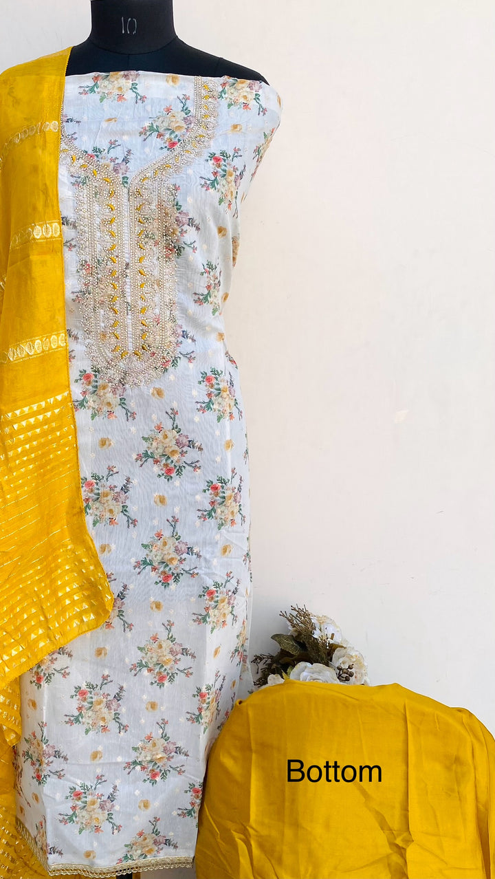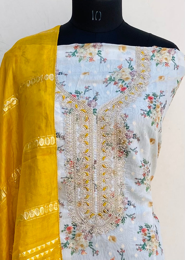 Designer Embroidered Suit Length 3 Piece Off White Mal Chanderi With Stone Work With Embroidered Mal Chanderi Dupatta & Mustard Colour Santoon Bottom