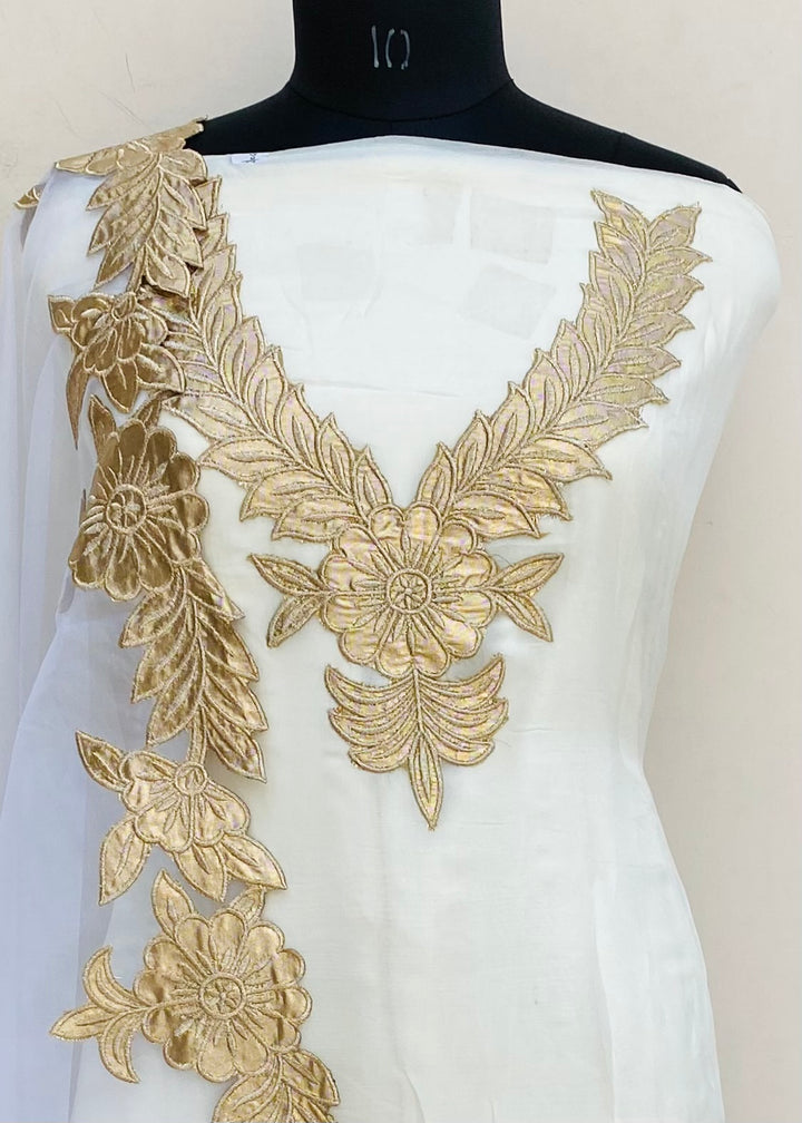 Designer Embroidered Suit Length 3 Piece Off White Organza With Embroidered Organza Dupatta & Same Colour Cotton Bottom