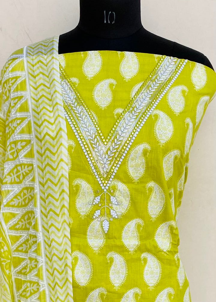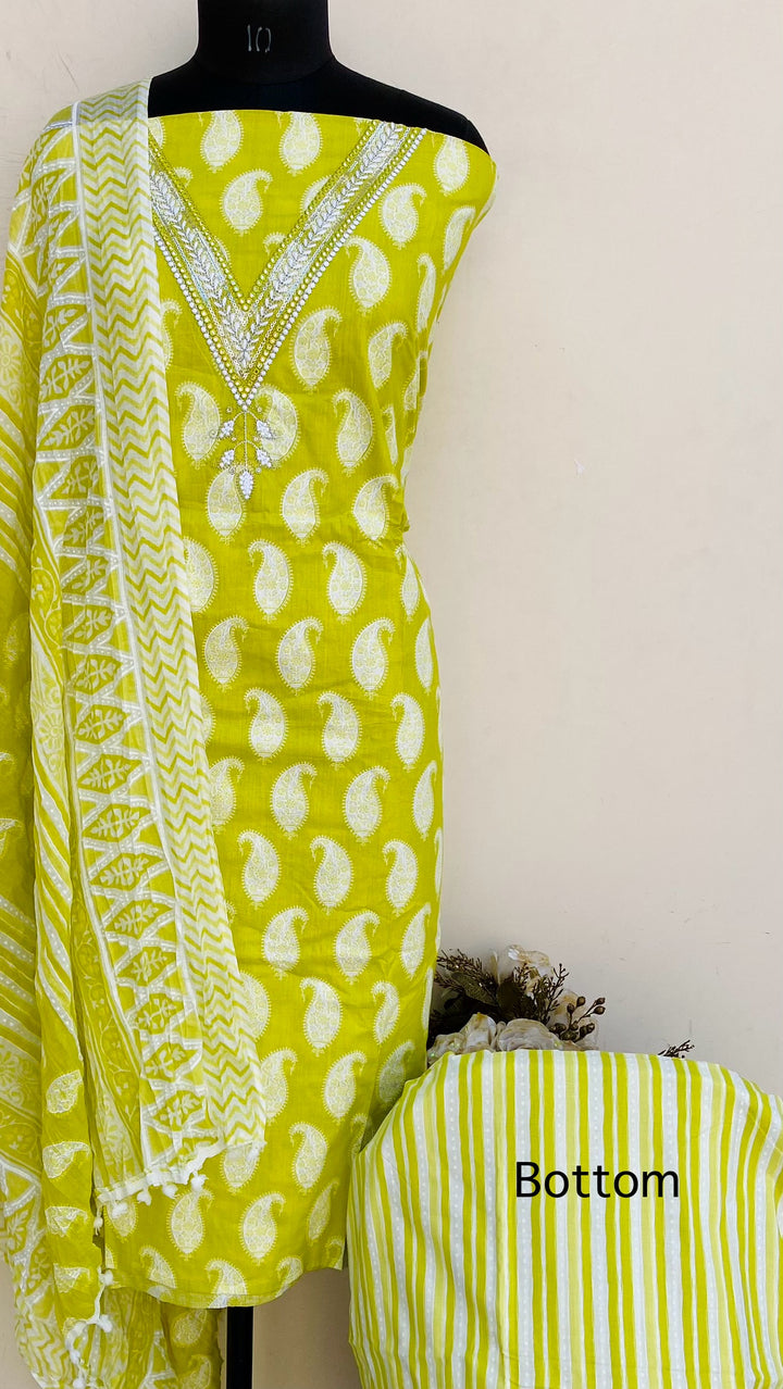 Designer Embroidered Suit Length 3 Piece Parrot Green Mal Cotton With Sequence Work With Printed Mal Cotton Dupatta & Printed Same Colour Cotton Bottom