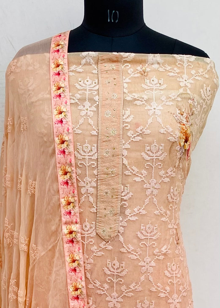 Designer Embroidered Suit Length 3 Piece Peach Georgette With Stone Work With Embroidered Pure Chiffon Dupatta & Same Colour Cotton Bottom