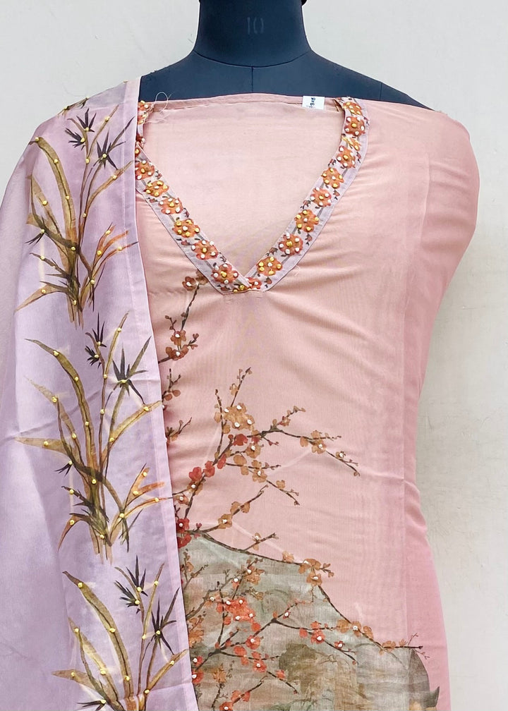 Designer Embroidered Suit Length 3 Piece Peach Linen With Printed Linen Dupatta & Same Colour Santoon Bottom