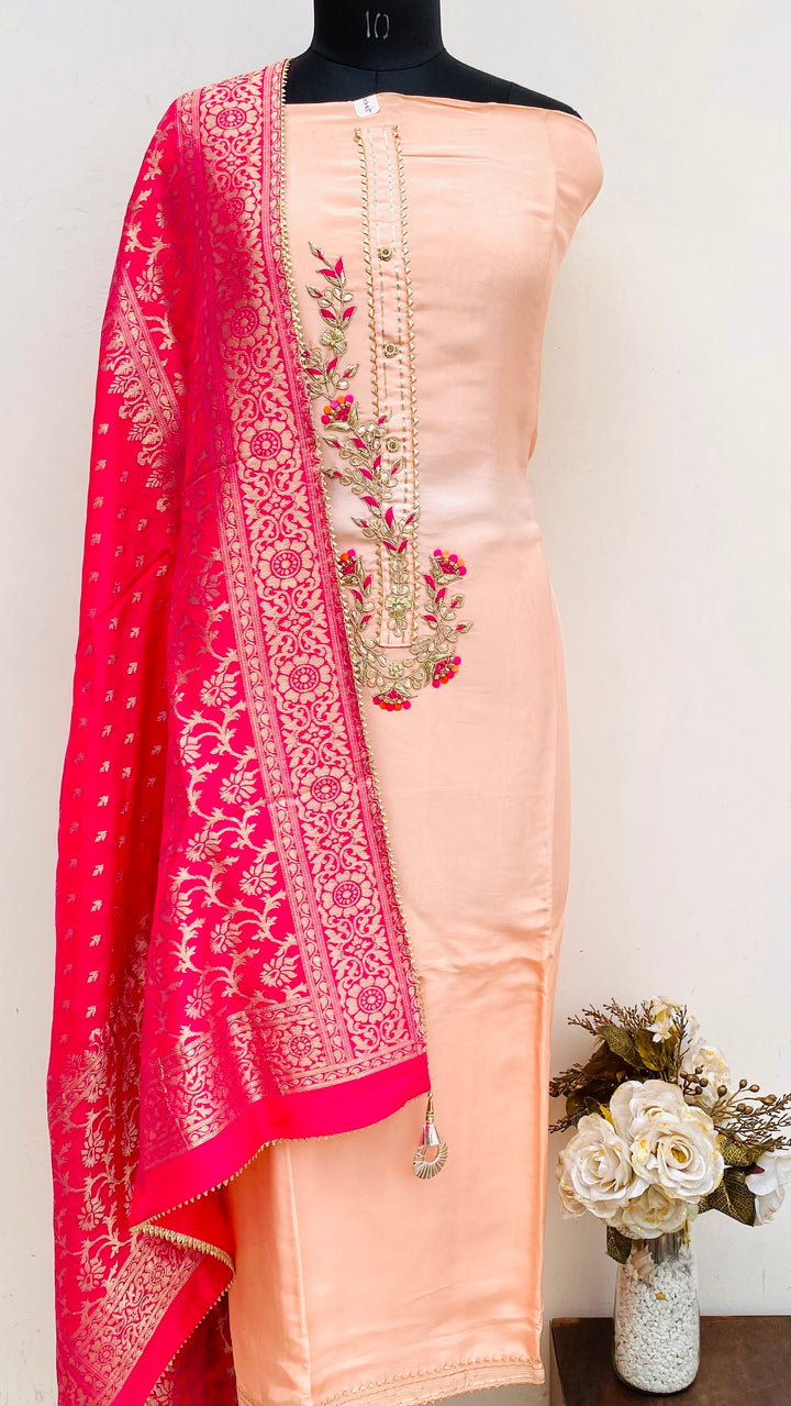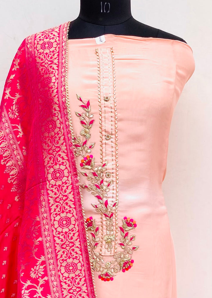 Designer Embroidered Suit Length 3 Piece Peach Mal Chanderi With Sequence & Pearl Work With Embroidered Mal Chanderi Dupatta & Pink Colour Cotton Bottom
