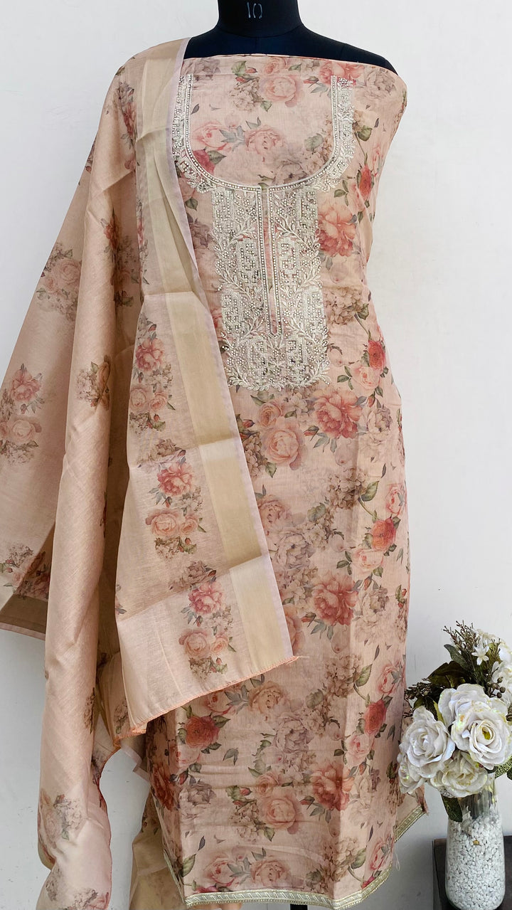 Designer Embroidered Suit Length 3 Piece Peach Mal Chanderi With Stone Work With Printed Mal Chanderi Dupatta & Same Colour Santoon Bottom