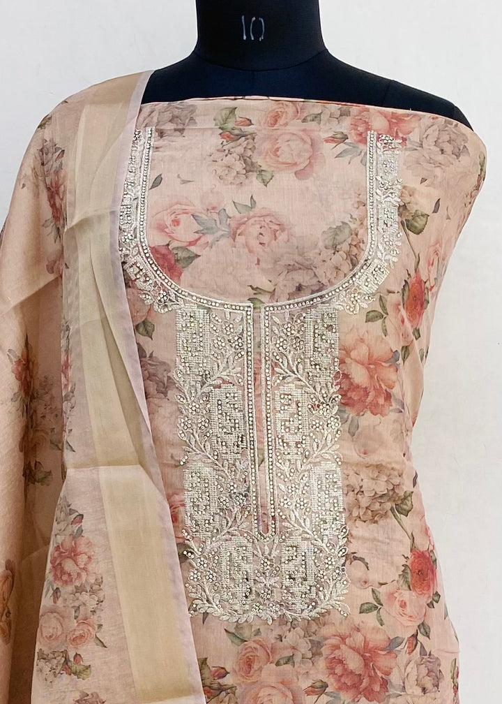 Designer Embroidered Suit Length 3 Piece Peach Mal Chanderi With Stone Work