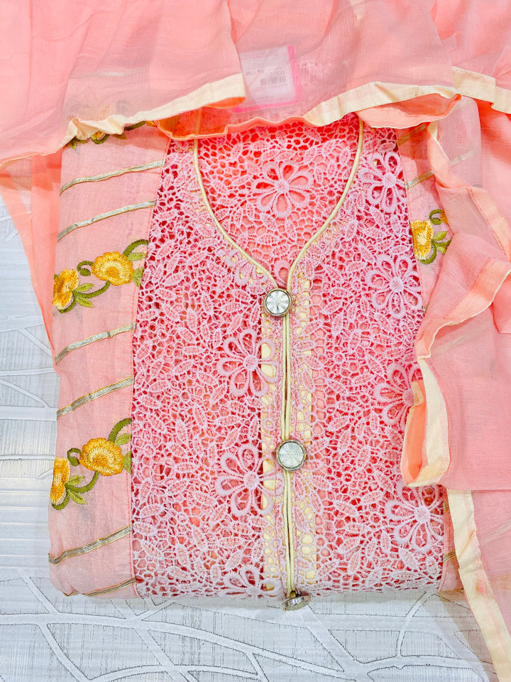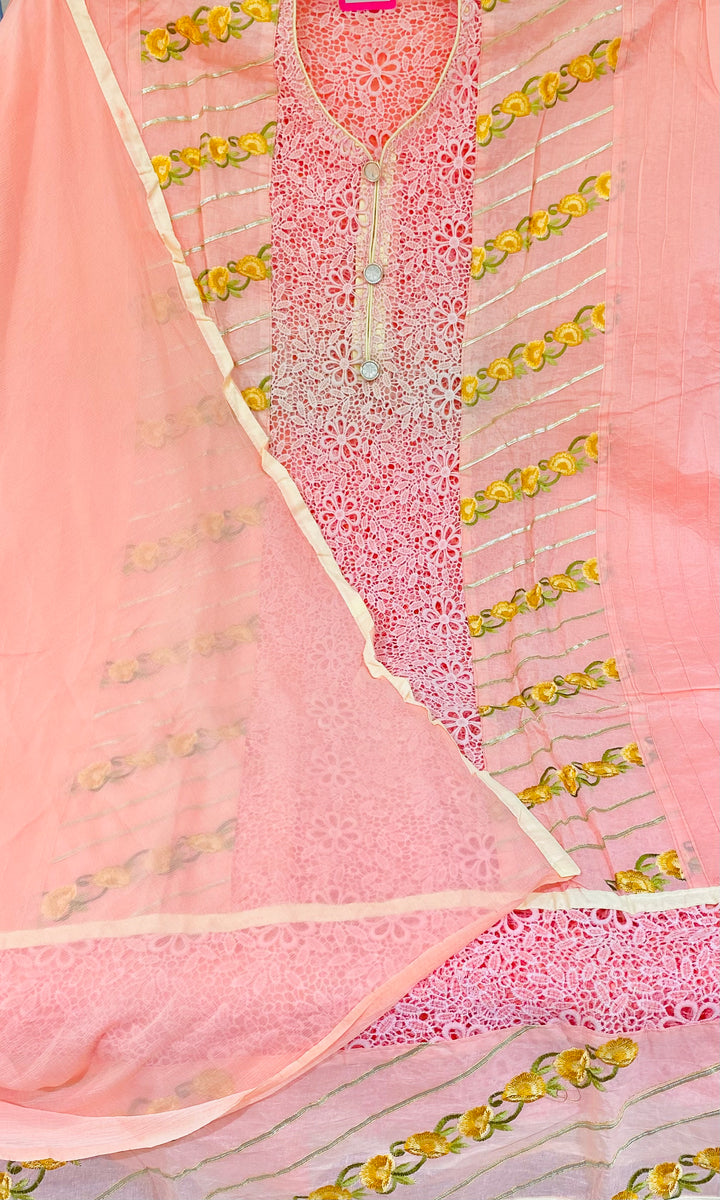 Designer Embroidered Suit Length 3 Piece Peach Organza with Chiffon Dupatta & Same Colour Cotton Bottom