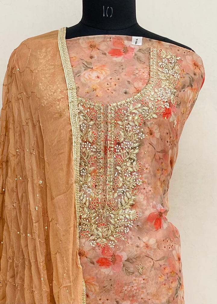 Designer Embroidered Suit Length 3 Piece Peach Organza With Pearl ,Cutdana & Sequence Work With Embroidered Pure Chiffon Dupatta & Same Colour Cotton Bottom