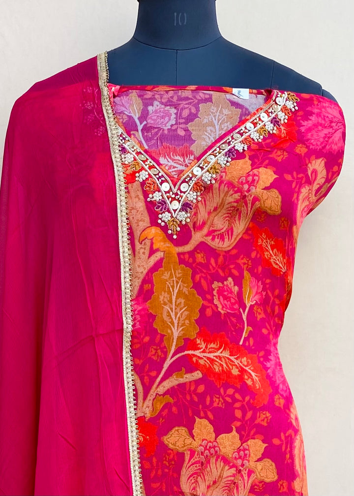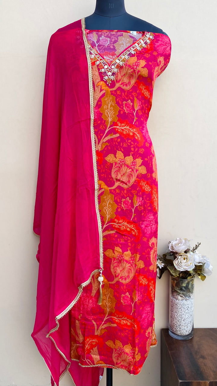 Designer Embroidered Suit Length 3 Piece Pink Crepe With Pearl Work With Pure Chiffon Dupatta & Same Colour Santoon Bottom