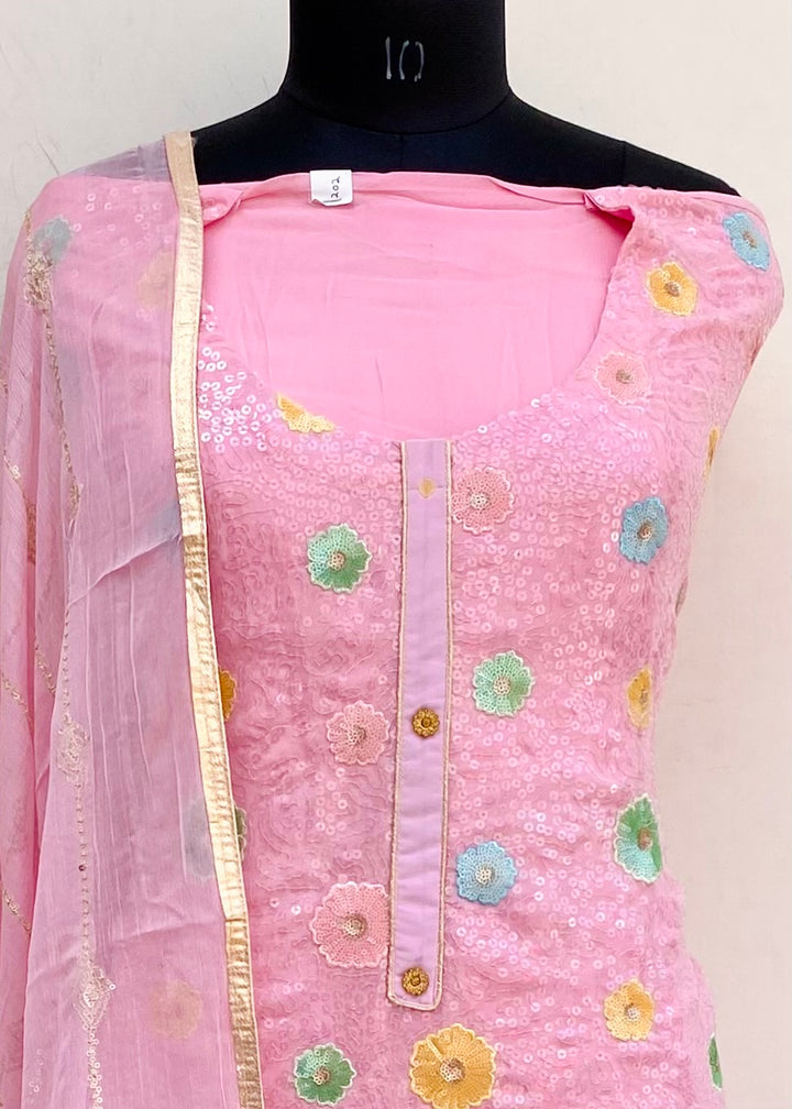 Designer Embroidered Suit Length 3 Piece Pink Georgette With Sequence Work With Embroidered Pure Chiffon Dupatta & Same Colour Cotton Bottom