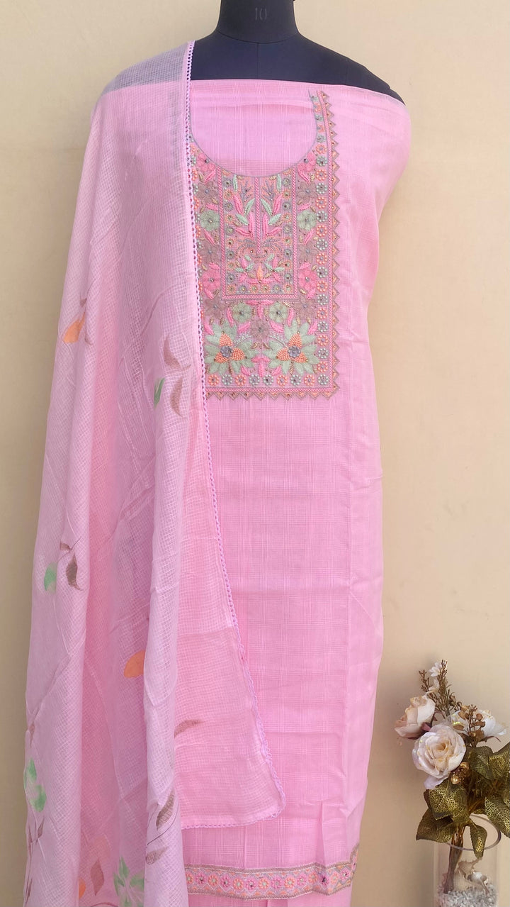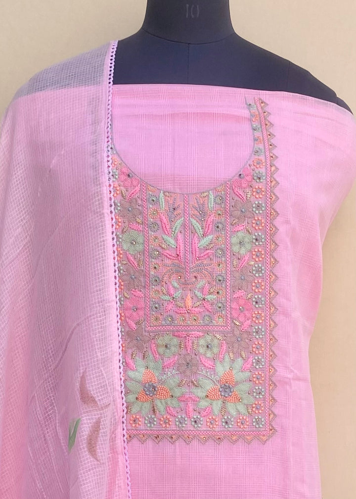 Designer Embroidered Suit Length 3 Piece Pink Kota With Kota Dupatta & Same Colour Cotton Bottom