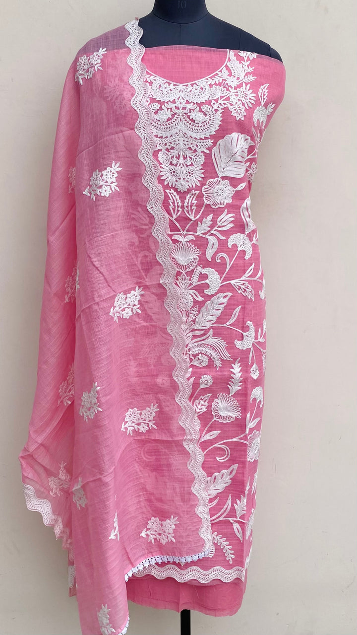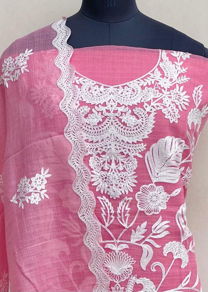 Designer Embroidered Suit Length 3 Piece Pink Kota With Embroidered Kota Dupatta & Same Colour Cotton Bottom
