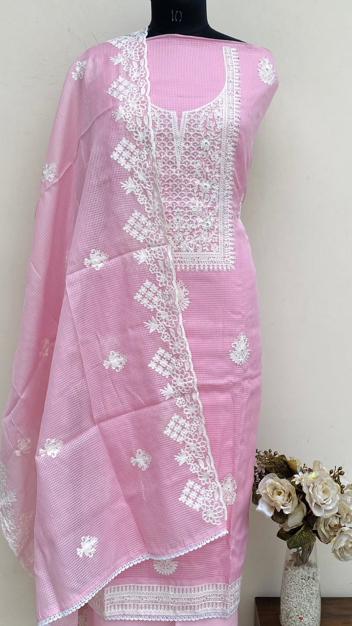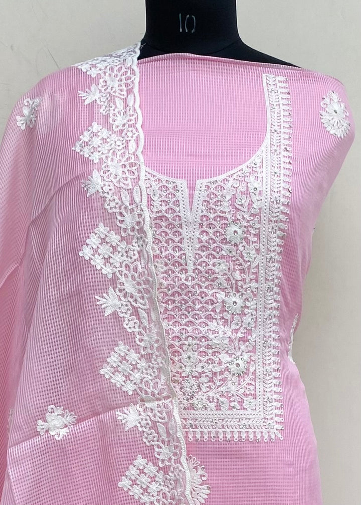 Designer Embroidered Suit Length 3 Piece Pink Kota With Embroidered Kota Dupatta & Same Colour Cotton Bottom