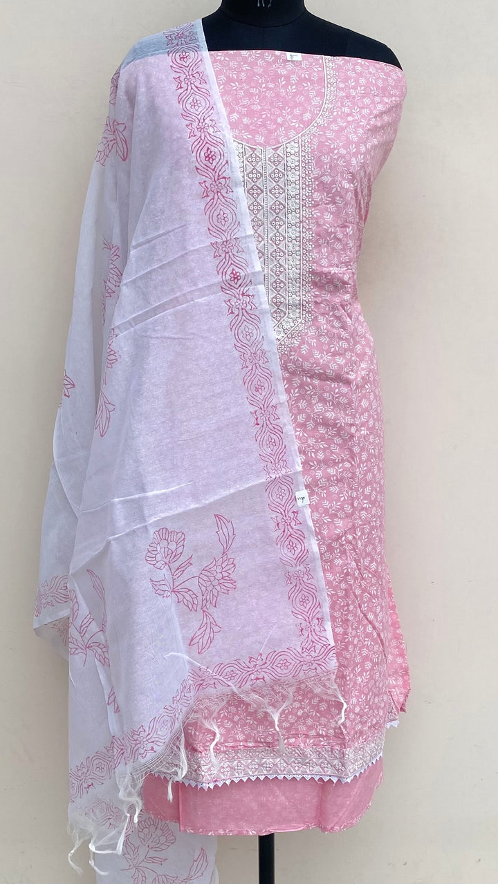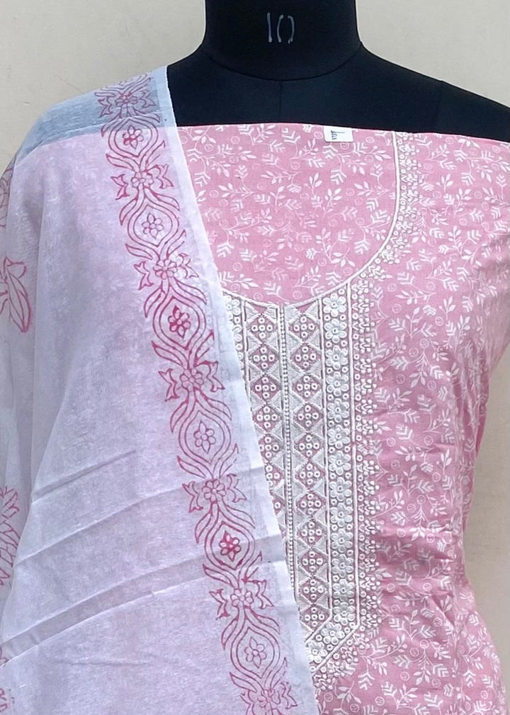 Designer Embroidered Suit Length 3 Piece Pink Linen With Printed Linen Dupatta & Same Colour Cotton Bottom