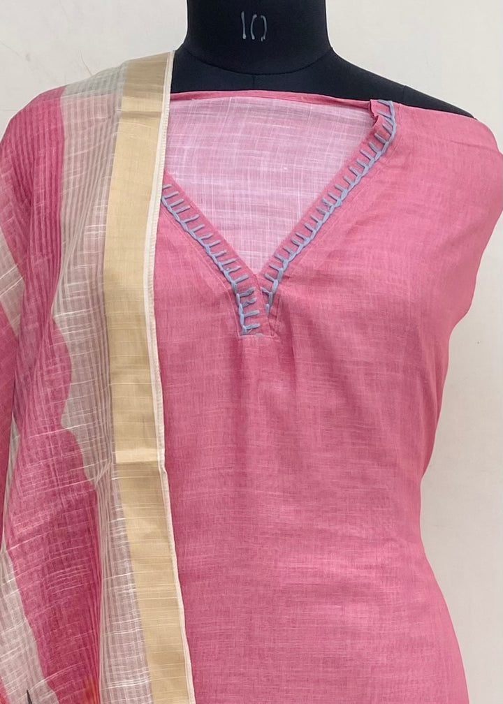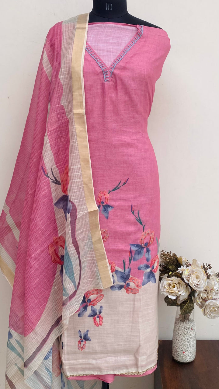 Designer Embroidered Suit Length 3 Piece Pink Linen With Cutdana Work With Printed Linen Dupatta & Same Colour Cotton Bottom