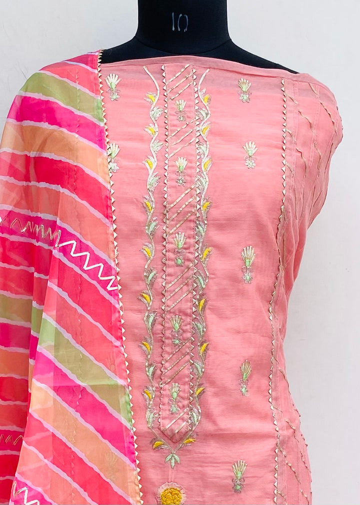Designer Embroidered Suit Length 3 Piece Pink Mal Chanderi With Printed Organza Dupatta & Same Colour Cotton Bottom