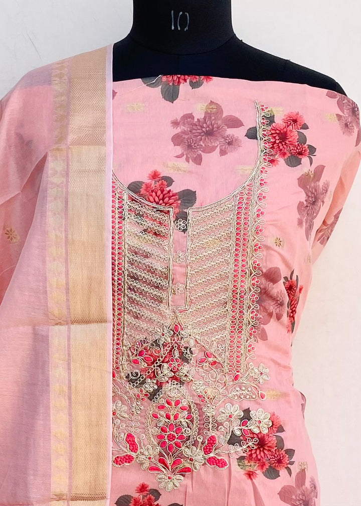 Designer Embroidered Suit Length 3 Piece Pink Mal Chanderi
