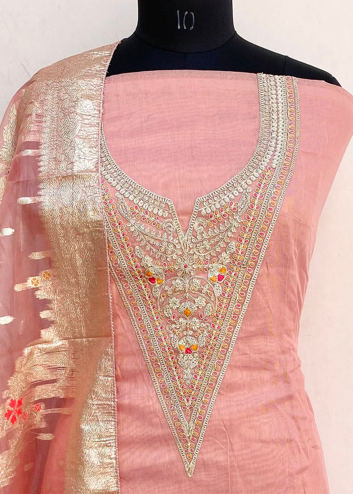 Designer Embroidered Suit Length 3 Piece Pink Mal Chanderi With Sequence Work