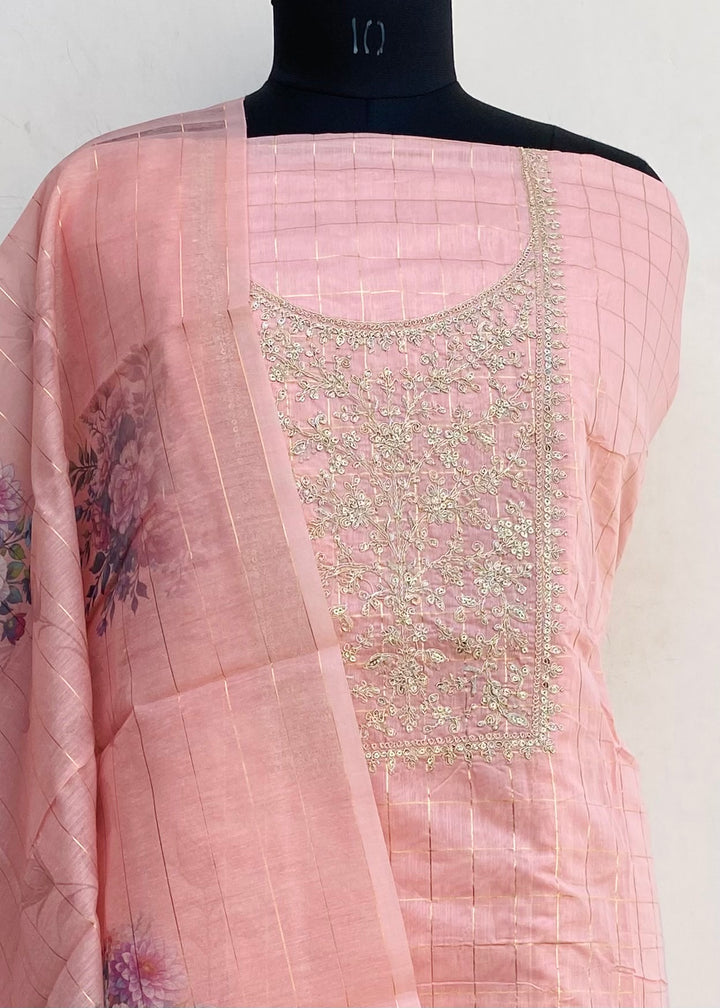 Designer Embroidered Suit Length 3 Piece Pink Mal Chanderi With Sequence Work