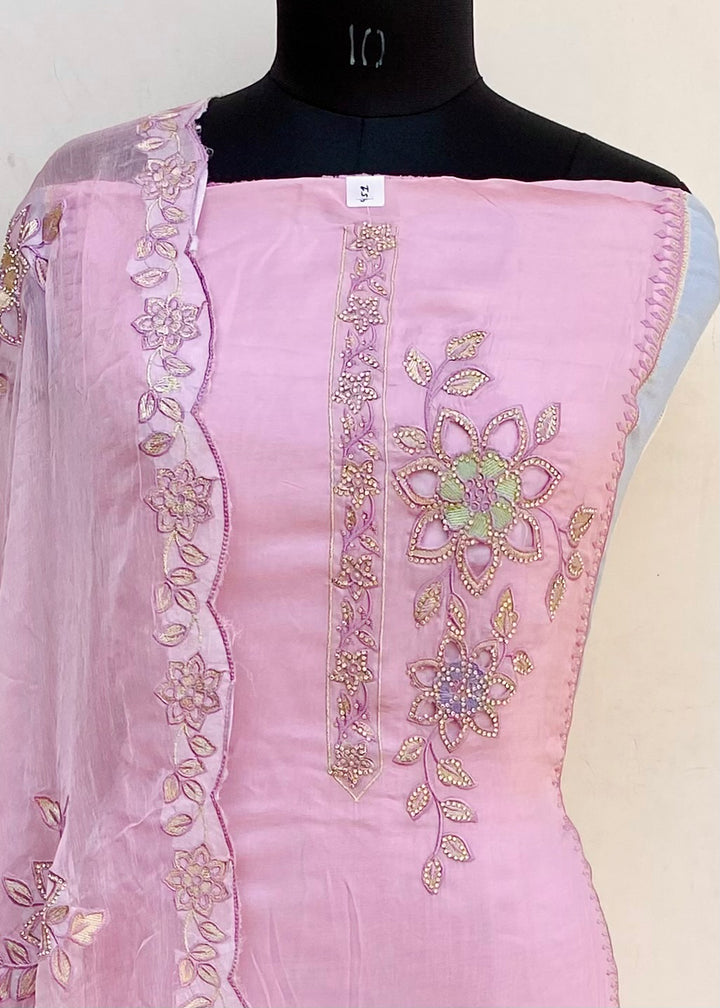 Designer Embroidered Suit Length 3 Piece Pink Mal Chanderi With Stone Work