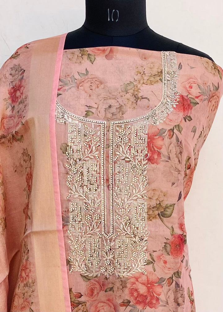 Designer Embroidered Suit Length 3 Piece Pink Mal Chanderi With Stone Work