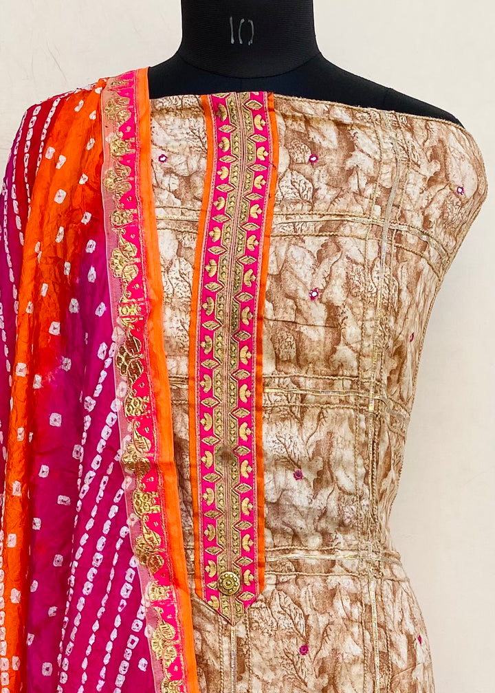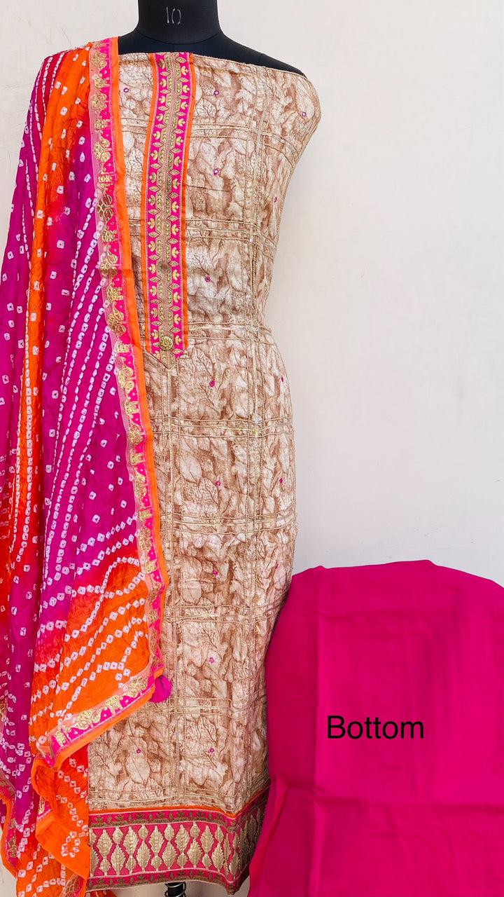 Designer Embroidered Suit Length 3 Piece Beige Mal Cotton With Printed Muslin Dupatta & Pink Colour Cotton Bottom