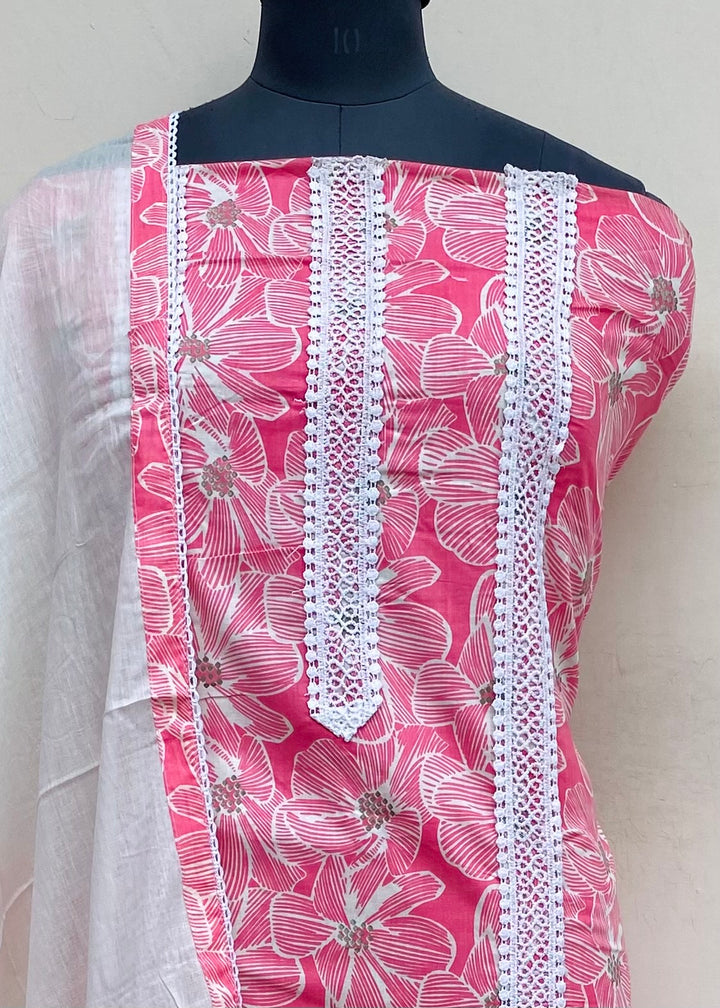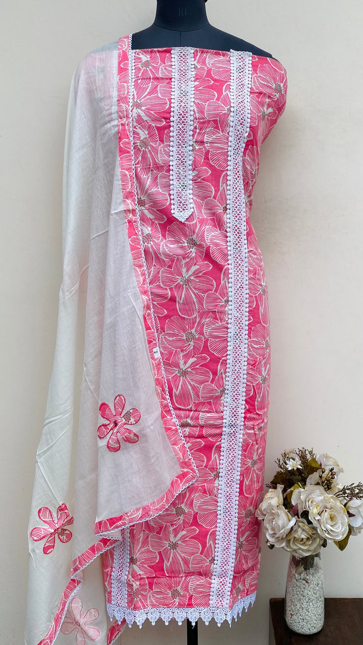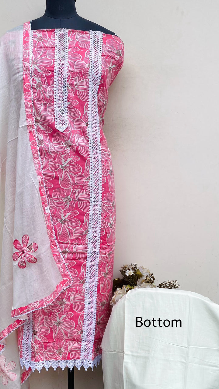 Designer Embroidered Suit Length 3 Piece Pink Mal Cotton With Embroidered Mal Cotton Dupatta & Cream Colour Cotton Bottom