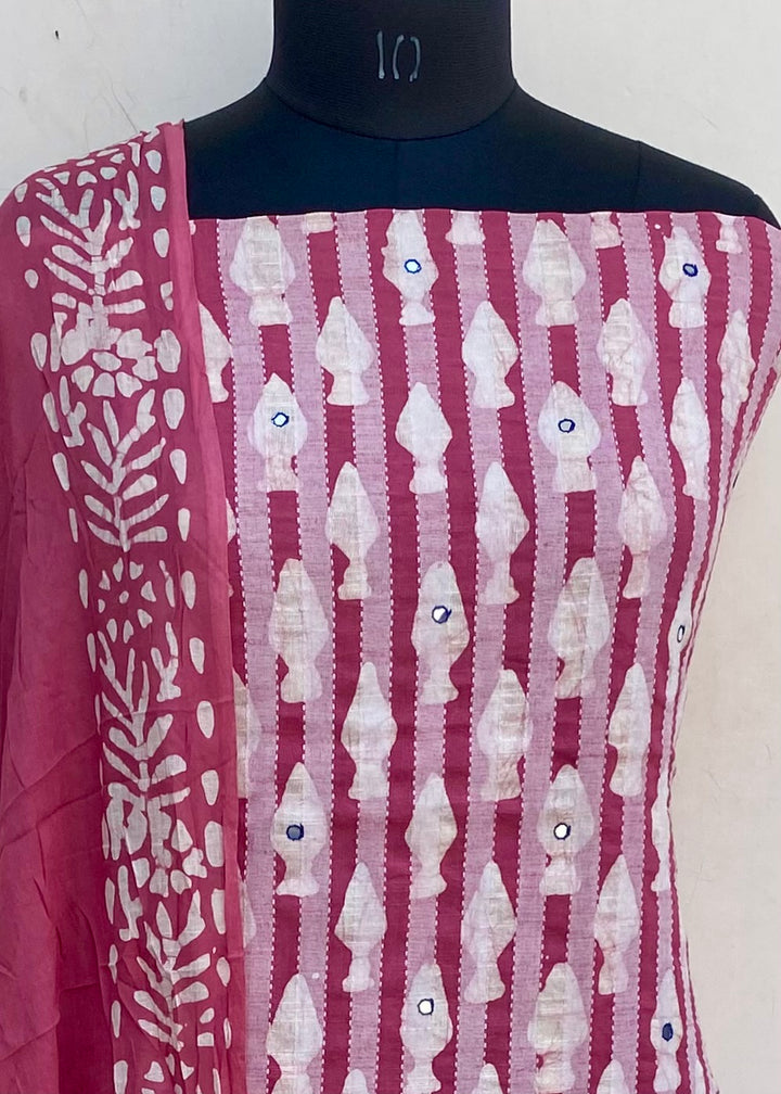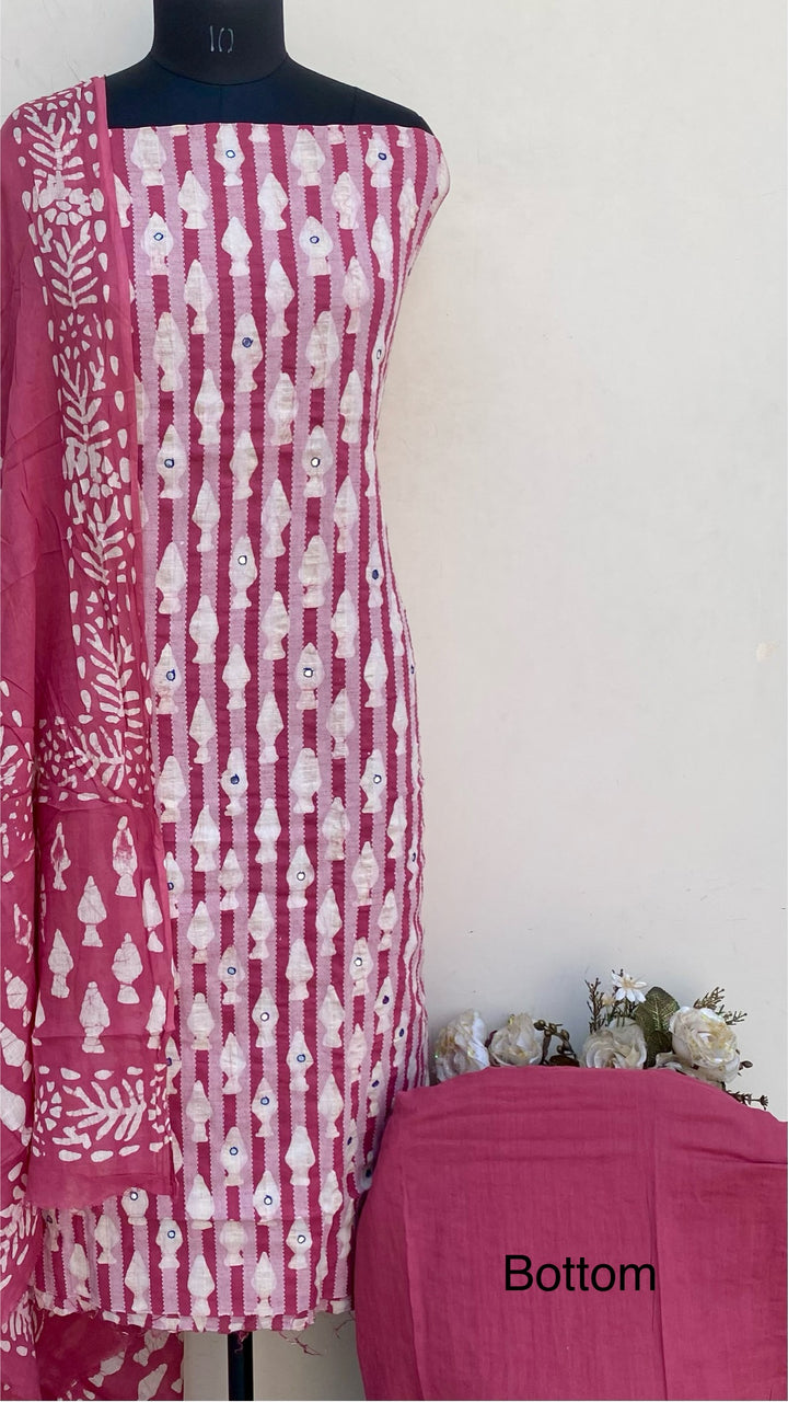 Designer Embroidered Suit Length 3 Piece Pink Mal Cotton With Printed Mal Cotton Dupatta & Same Colour Cotton Bottom