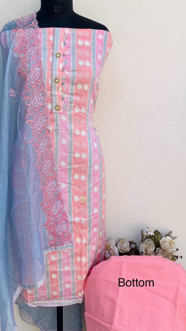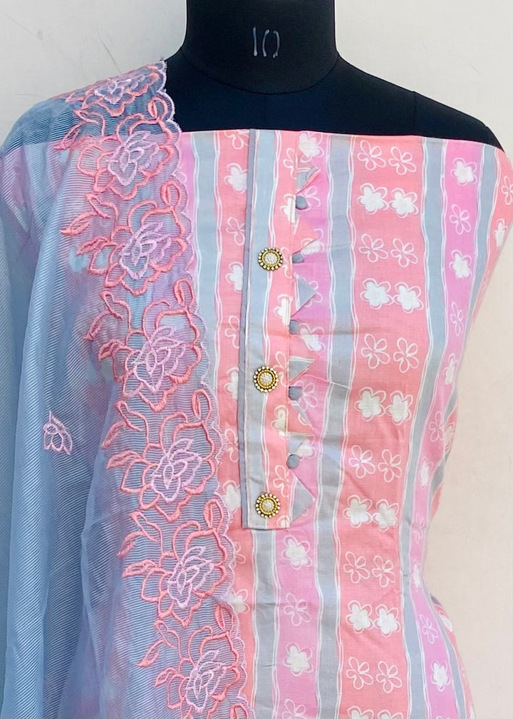 Designer Embroidered Suit Length 3 Piece Pink Mal Cotton With Embroidered Kota Dupatta & Same Colour Cotton Bottom