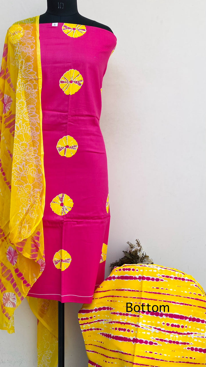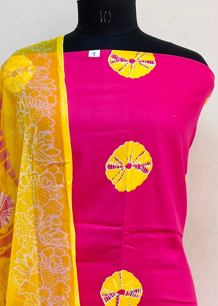 Designer Embroidered Suit Length 3 Piece Pink Mal Cotton With Printed Chiffon Dupatta & Printed Yellow Colour Cotton Bottom
