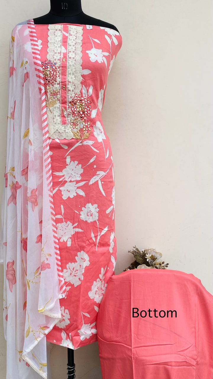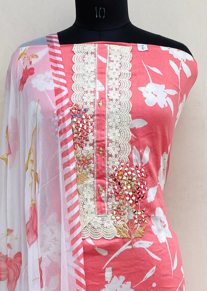 Designer Embroidered Suit Length 3 Piece Pink Mal Cotton With Mirror Work With Printed Pure Chiffon Dupatta & Same Colour Cotton Bottom
