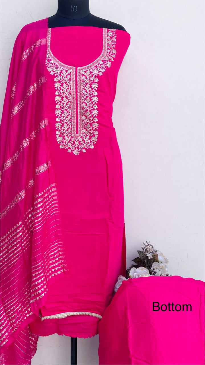 Designer Embroidered Suit Length 3 Piece Pink Muslin Cotton With Embroidered Mal Chanderi Dupatta & Same Colour Santoon Bottom