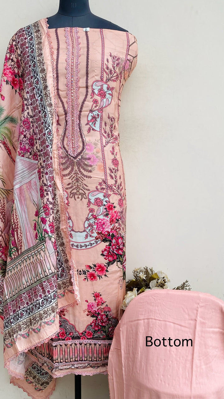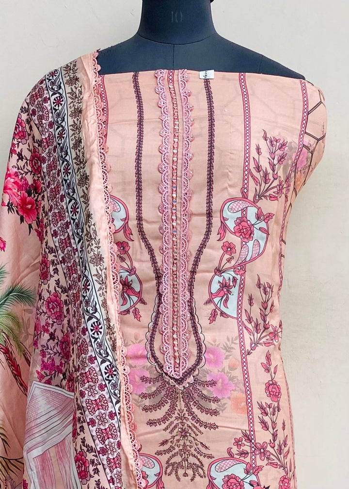 Designer Embroidered Suit Length 3 Piece Pink Muslin Cotton With Mirror & Stone Work With Printed Muslin Dupatta & Same Colour Cotton Bottom