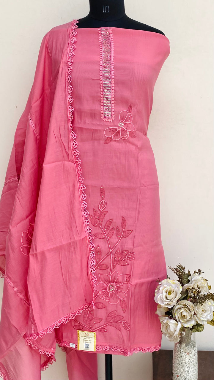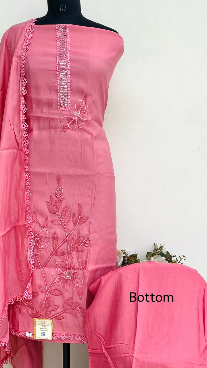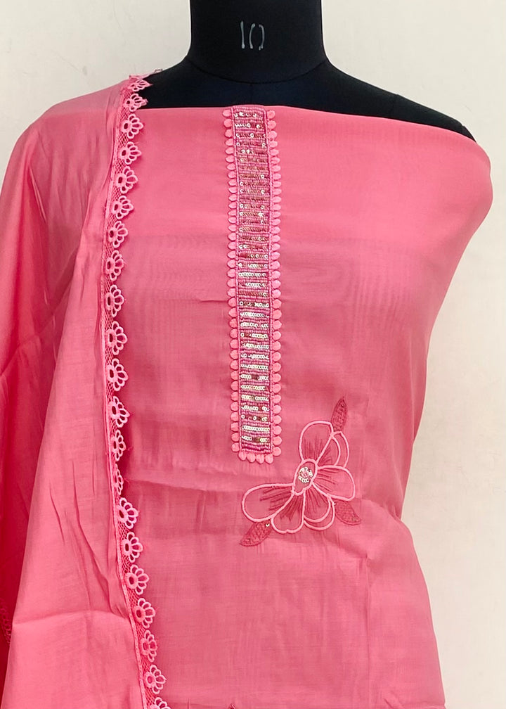 Designer Embroidered Suit Length 3 Piece Pink Muslin Cotton With Pearl & Sequence Work With Embroidered Muslin Dupatta & Same Colour Cotton Bottom