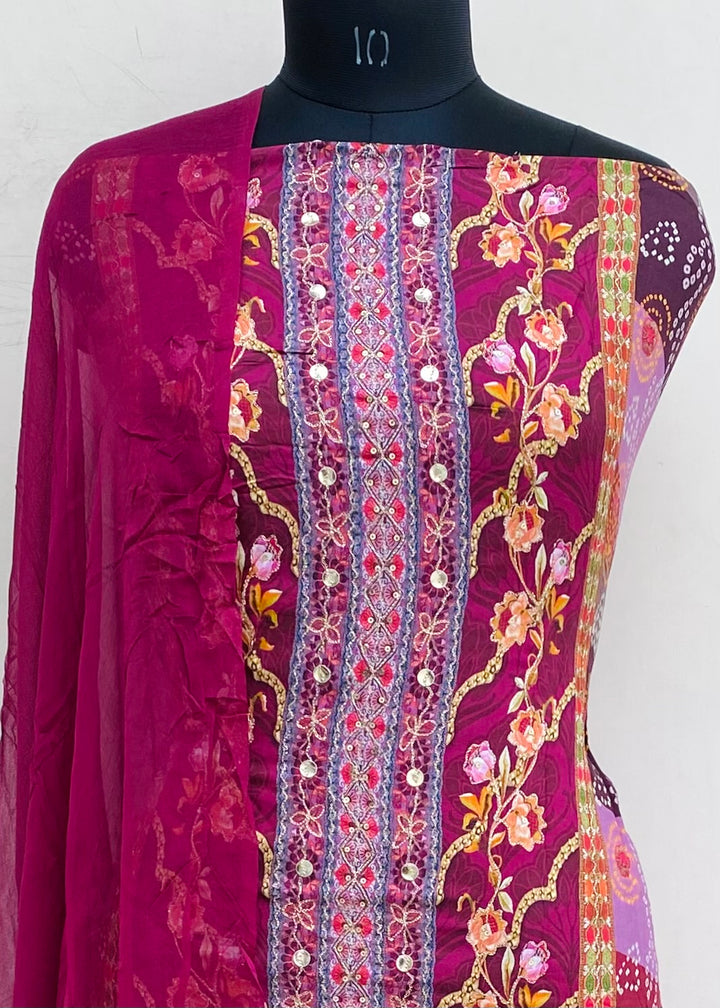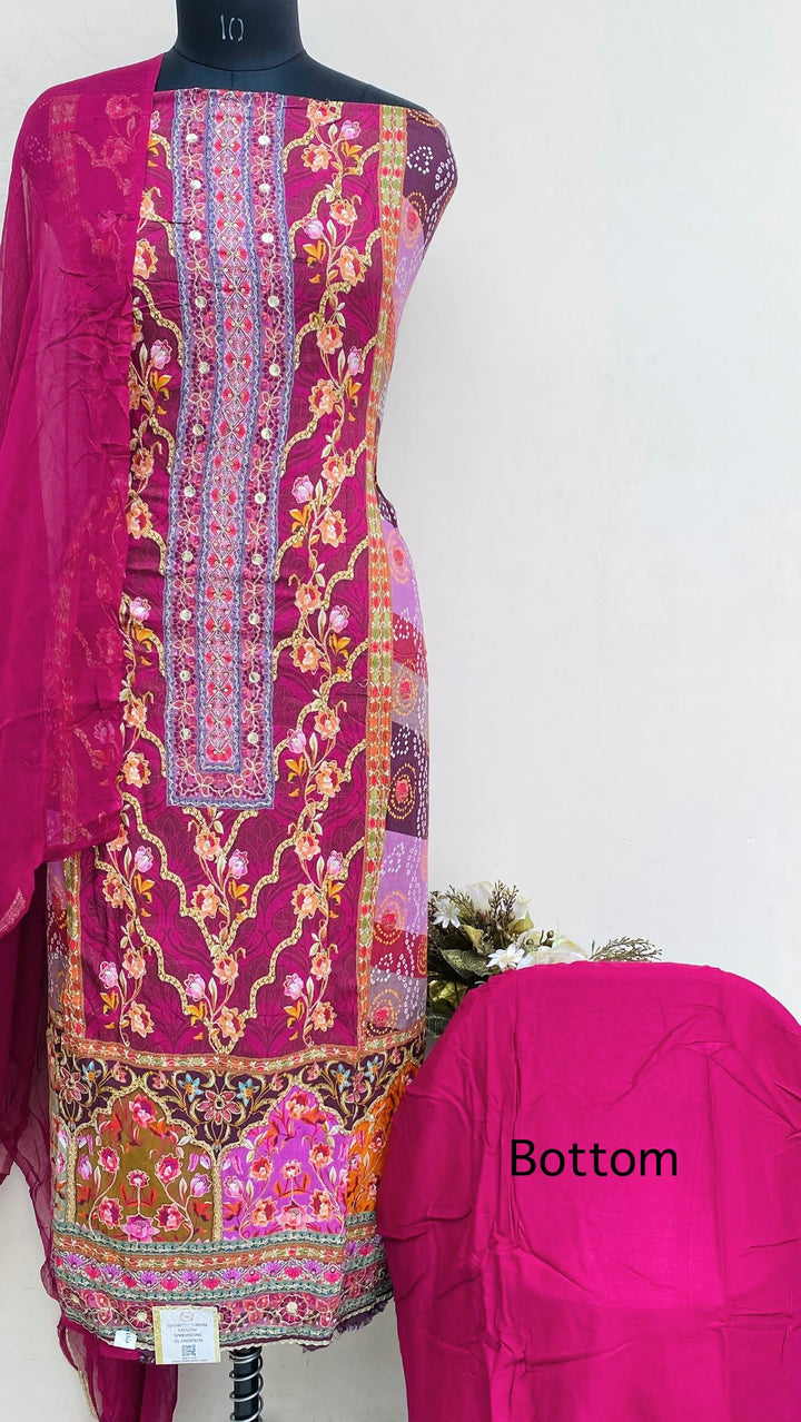 Designer Embroidered Suit Length 3 Piece Pink Muslin Cotton With Sequence Work With Pure Chiffon Dupatta & Same Colour Cotton Bottom