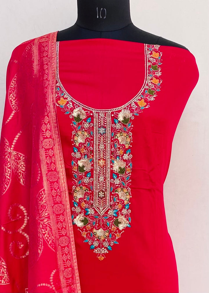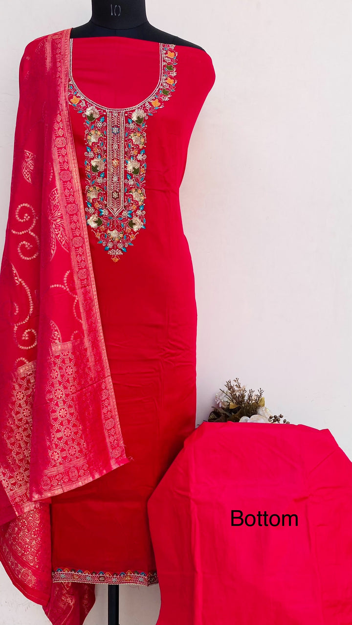 Designer Embroidered Suit Length 3 Piece Pink Muslin Cotton With Sequence Work With Embroidered Muslin Dupatta & Pink Colour Cotton Bottom