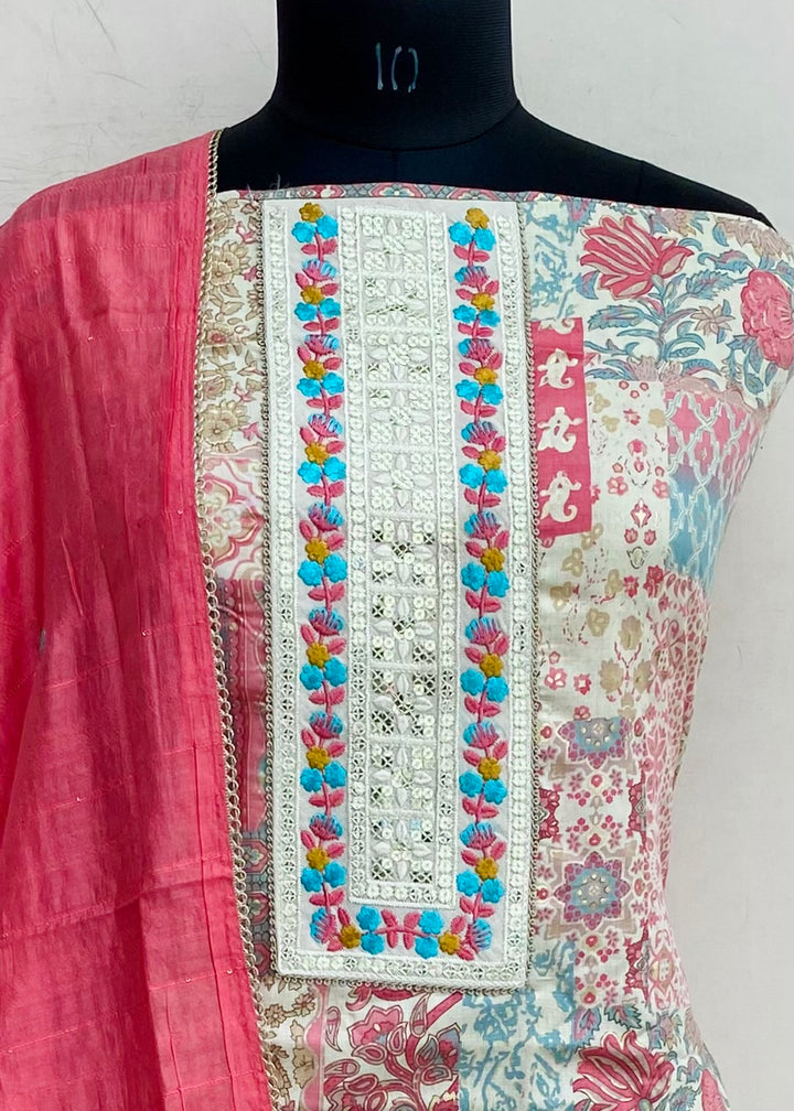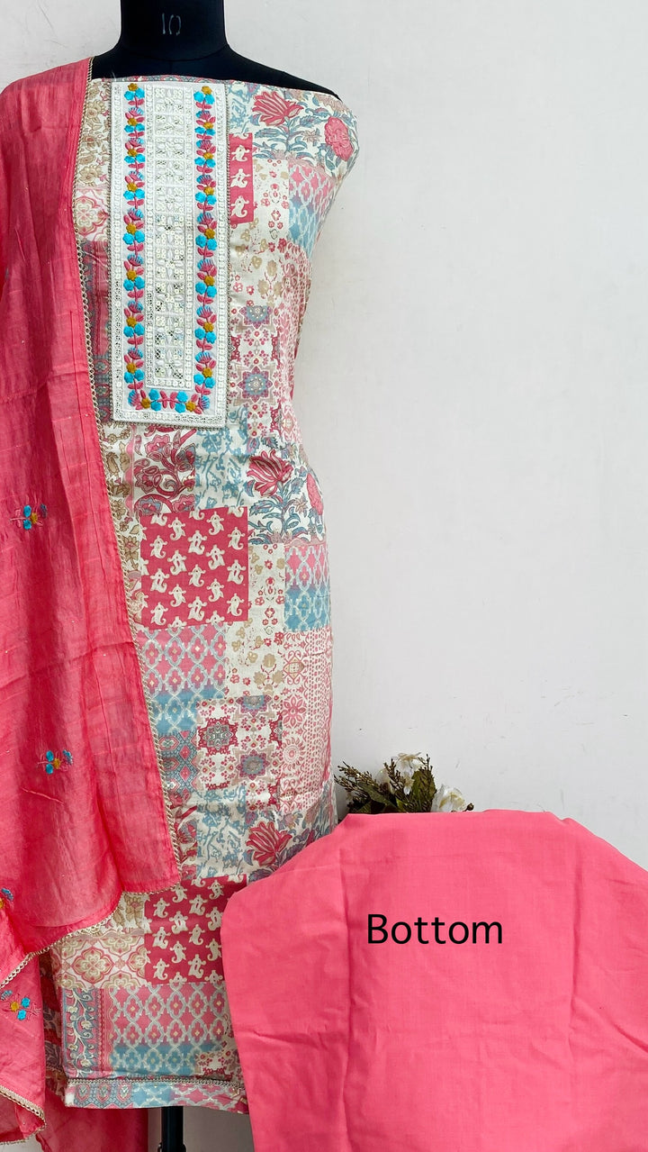 Designer Embroidered Suit Length 3 Piece Pink Muslin Cotton With Sequence Work With Embroidered Muslin Dupatta & Same Colour Cotton Bottom