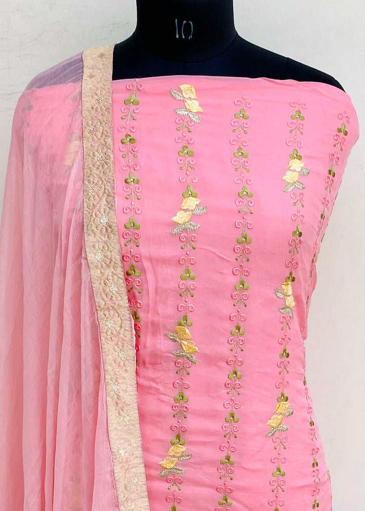 Designer Embroidered Suit Length 3 Piece Pink Organza With Pure Chiffon Dupatta & Same Colour Cotton Bottom