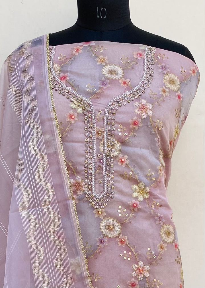 Designer Embroidered Suit Length 3 Piece Pink Organza With Pearl & Sequence Work