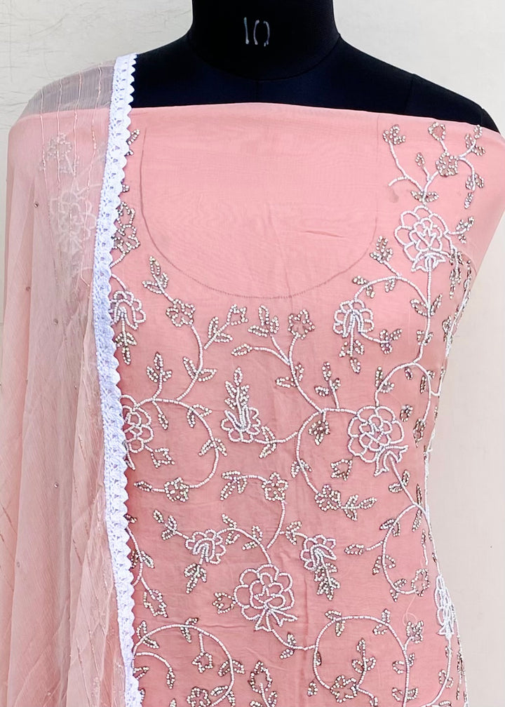 Designer Embroidered Suit Length 3 Piece Pink Organza With Stone & Pearl Work