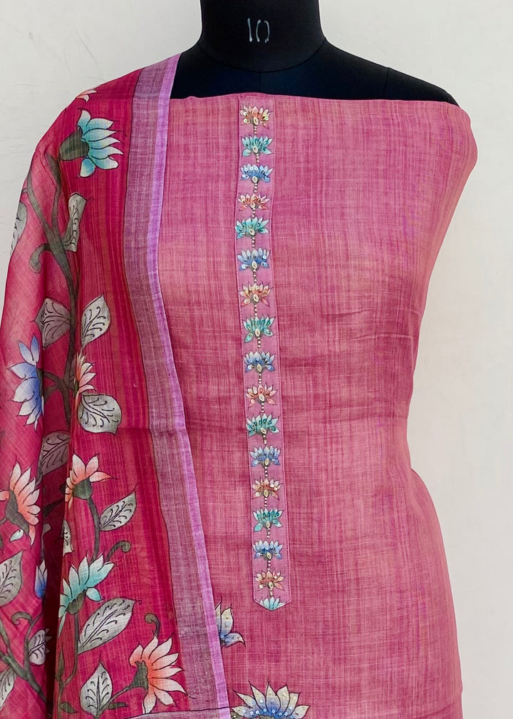 Designer Embroidered Suit Length 3 Piece Pink Tissue With Sequence, Pearl & Cutdana Work With Printed Tissue Dupatta & Same Colour Cotton Bottom