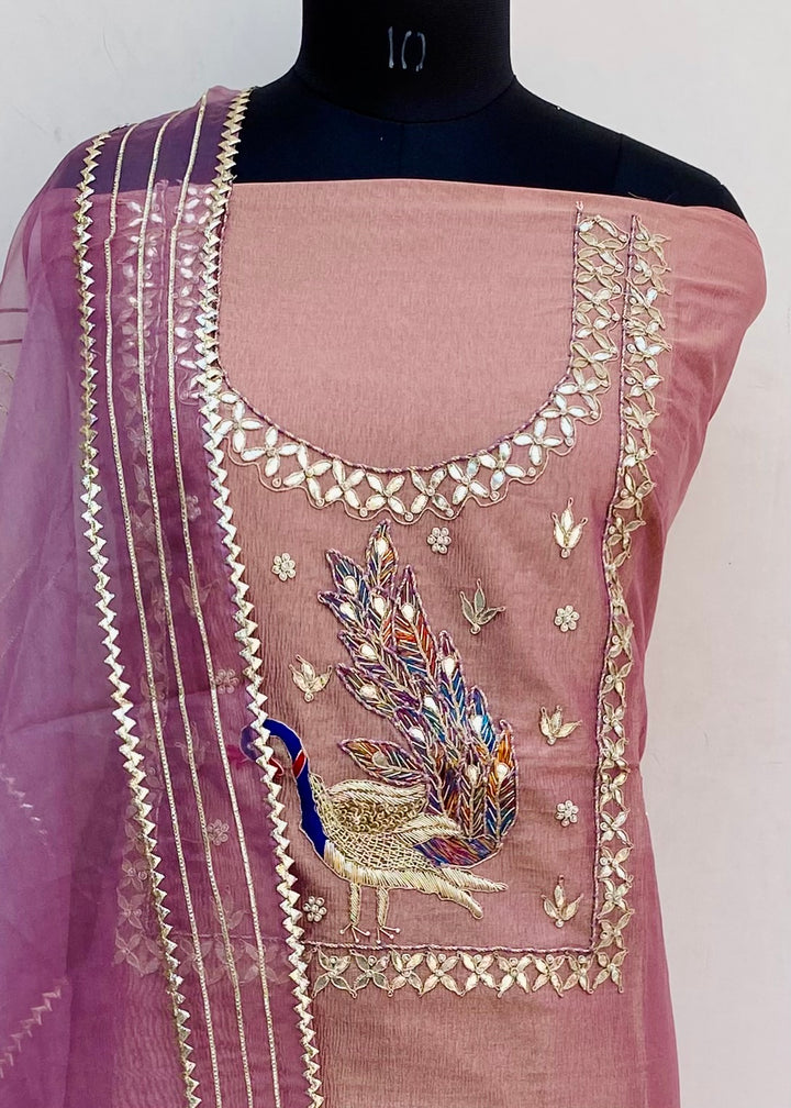 Designer Embroidered Suit Length 3 Piece Pink With Pearl & Gotta Patti Work With Embroidered Organza Dupatta & Same Colour Santoon Bottom